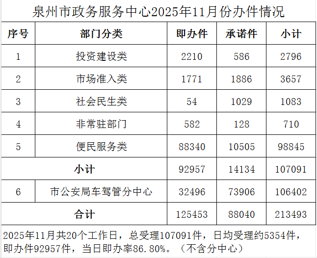 泉州市政务服务中心2025年11月份办件情况