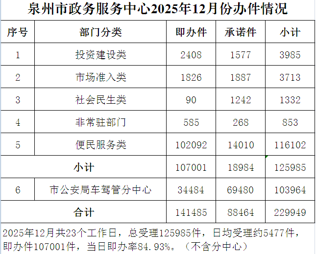 泉州市政务服务中心2025年12月份办件情况